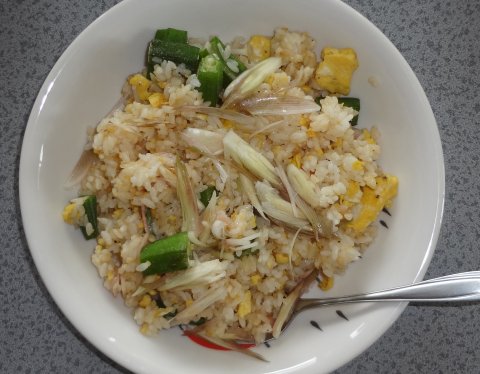 - オクラ、3の卵を戻し、 調味料を入れて炒め合わせる。塩加減は適宜調整。