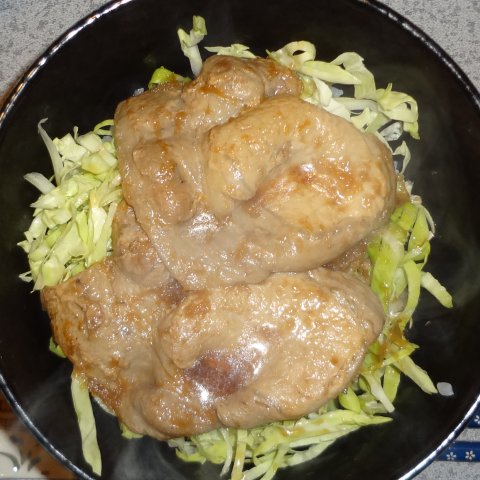 器にごはんを盛ってキャベツ、2をのせ、フライパンに残ったタレをかけ、出来上がり。