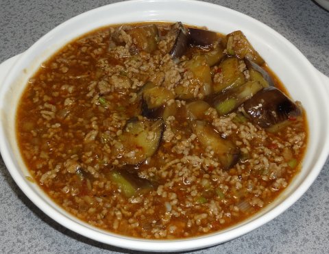 - フッ素樹脂加工のフライパンにサラダ油大さじ1を熱し、豚ひき肉 を入れていためる。甜麺醤と豆板醤 、2のにんにくとしょうがを加え、 香りがたつまで焦がさないようにいためる。分離した油が赤く透き通ったら、 スープと3のなすを加える。