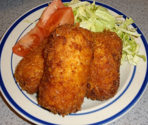 - フライパンに揚げ油を入れて180度に熱する。7を2個ずつ入れて強めの中火できつね色に揚げる。 器に盛って混ぜ合わせたaをかける。キャベツ、 トマトを添える。 【KP】少しずつ揚げることで、油の温度が急激に下がることを防ぐ