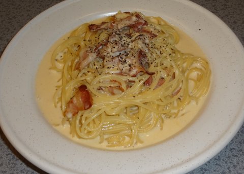 - クリームソースにパスタを投入し、手早く絡める。絡めたら、ボールの卵をパンに加えるが、 フライパンが熱すぎるようだったら、ボールにパスタを投入するようにする。 卵とパスタを手早く絡めたら完成。