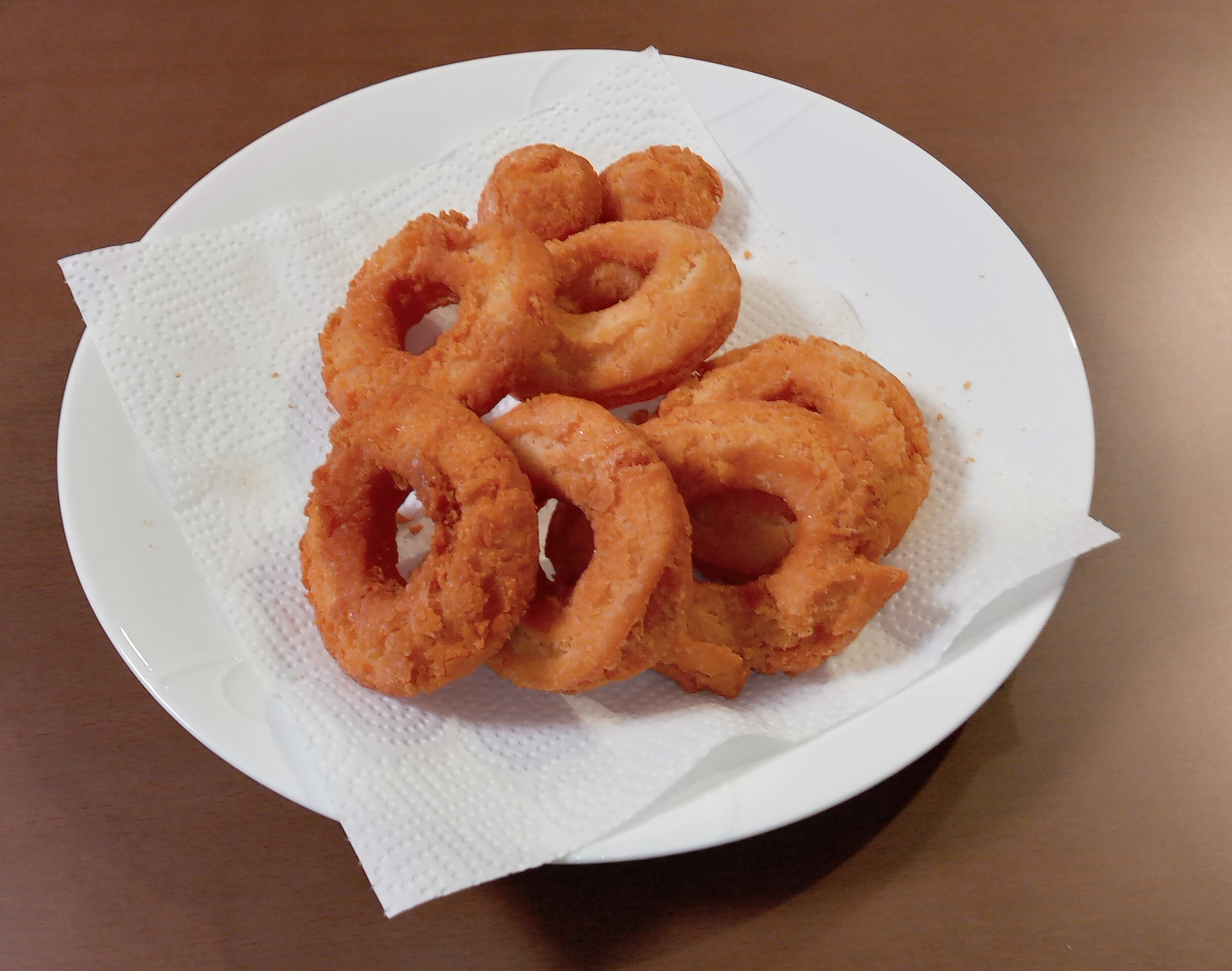 - 生地に軽く打ち粉をしてラップに挟み約8㎜厚にのす。打ち粉をした型で抜く。割り箸で切り込みをいれるとミスド風に仕上がる。